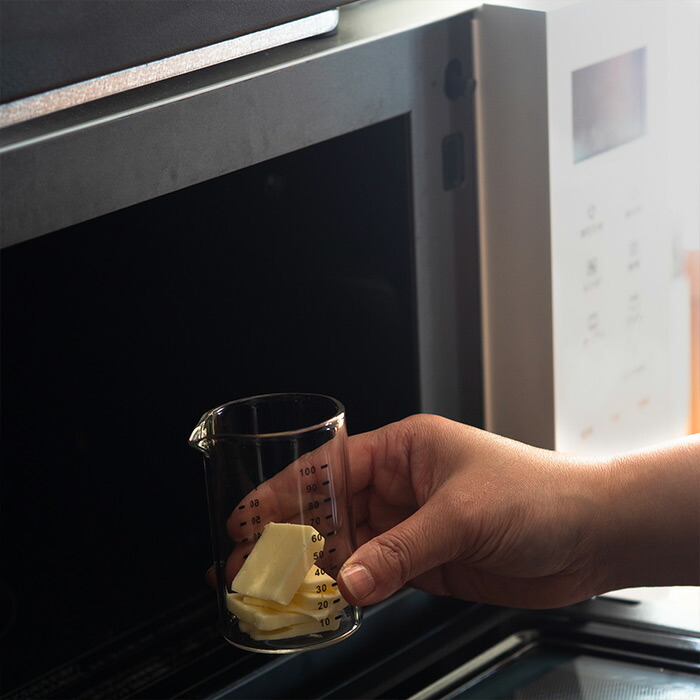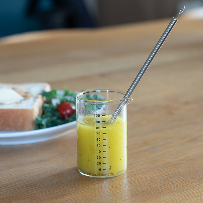 100mlサイズは10ml単位の目盛り付きで、一回分の自家製ドレッシングやソース作り、製菓、お酒の計量などに最適です。控えめでスタイリッシュなグレーの目盛りは、ガラスの透明感を邪魔せず、どんなキッチンにもスッと馴染みます。