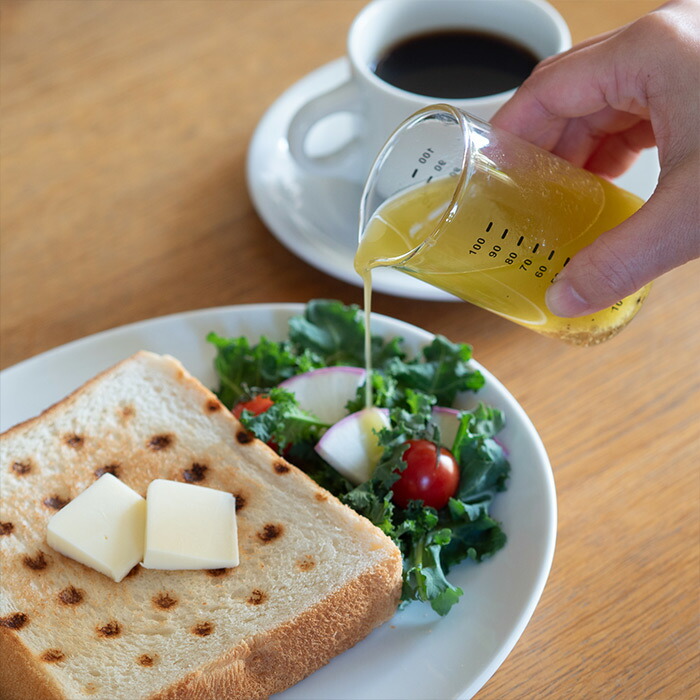注ぎ口のキレが良く、液だれしにくい設計なので、計量後はそのまま食卓へ。ミルクや手作りのドレッシング、ソースを入れるピッチャーやミニボトルとしても使えます。「道具」としての機能性と、「器」としての美しさを兼ね備えた多機能さが、ミニマル派の心をくすぐります。